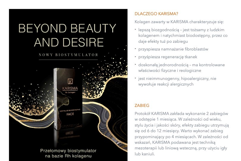 Preparat KARISMA to biostymulator, który bazuje na stymulacji organizmu do regeneracji, do tworzenia kluczowych dla elastyczności i jakości skóry włókien kolagenu czy elastyny. KARISMA jako pierwszy biostymulator na polskim rynku, oparty jest o rekombinowany kolagen ludzki, uzyskiwany z hodowli jedwabników.